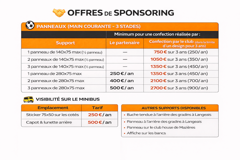 - Pour une aide à partir de 100€, nous pouvons afficher votre logo sur la vidéo des matchs partagée sur les réseaux sociaux.