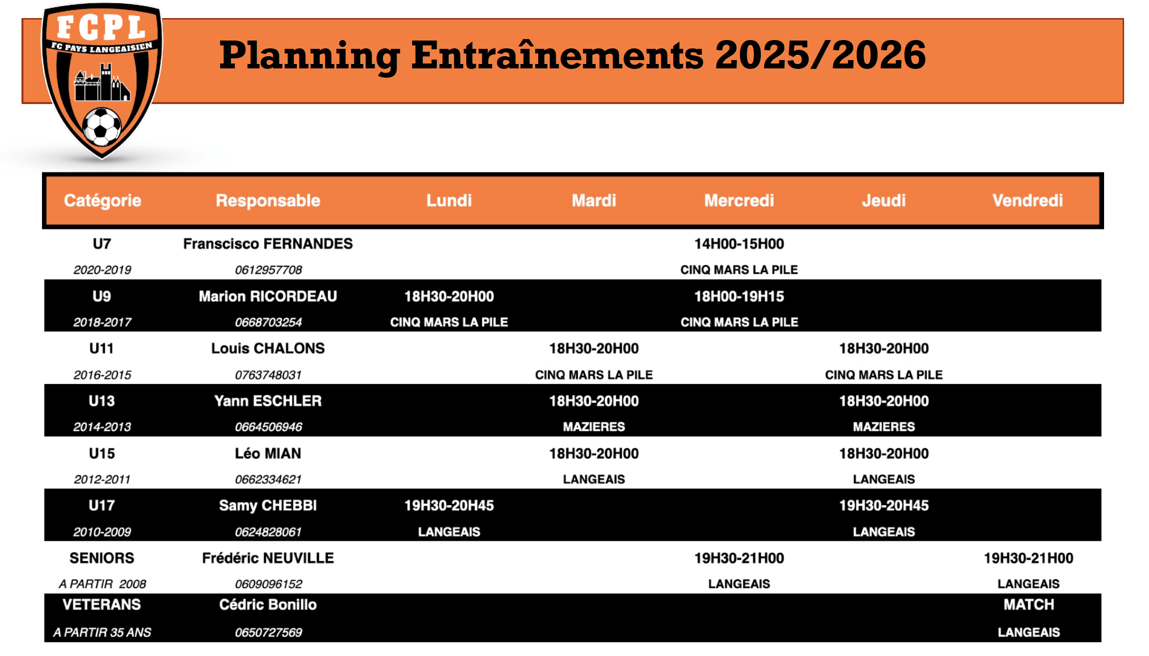 Bienvenue sur le site officiel du Fc Pays Langeaisien AGENDA DU CLUB Score’n’co – Football Club Pays Langeaisien PLANNING ENTRAINEMENTS